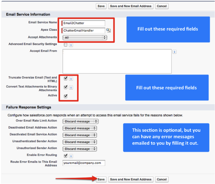 Note: If you are having problems with the "ChatterEmailHandler" Apex Class not being available for lookup. Go to Develop => Apex Classes, click on "ChatterEmailHandler" class and copy "ChatterEmailHandler" text from Constructors => Signature section without "()". Now copy this in the new Email Service lookup field.